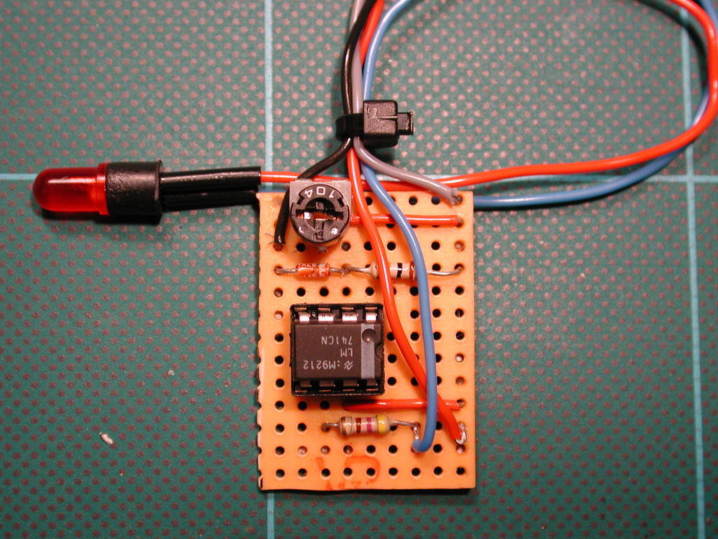 A low voltage circuit to warn of battery discharge. A simple circuit using the LM741 chip. I've set the unit to light